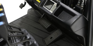 The ergonomically designed operator compartment promotes greater operator comfort and efficiency, with a spacious floorboard, small steering wheel diameter, hood-mounted levers, cowl-mounted SMART dash, and comfortable full-suspension vinyl seat. The accelerator and brake pedals are also optimally positioned for smooth transitions, reducing operator fatigue.