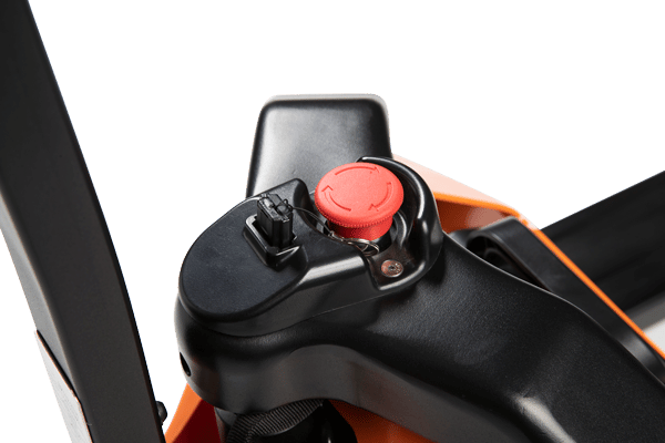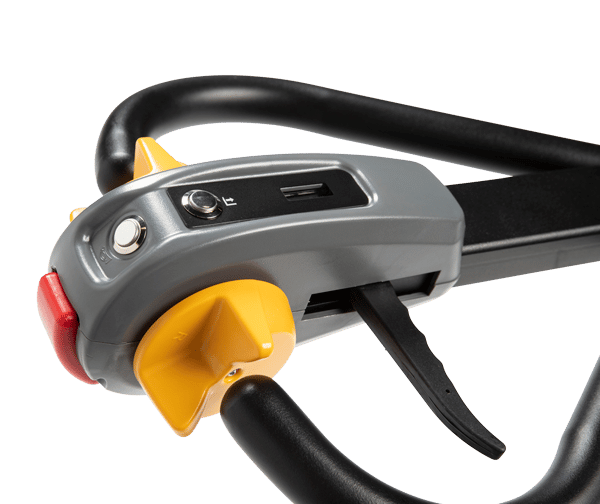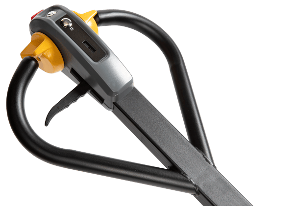 • Tiller Arm Control: Travel, lift, and lower functions are located in the ergonomic operator handle. All operator controls are accessible without having to lift one's hand from the loop handle. The control head is designed to allow easy operation with either hand and includes a belly button reversing switch, dual butterfly travel controls, horn, battery discharge indicator and manual lowering control for quick and efficient operation. The low mounted tiller arm offers excellent operator comfort and minimum steering effort.