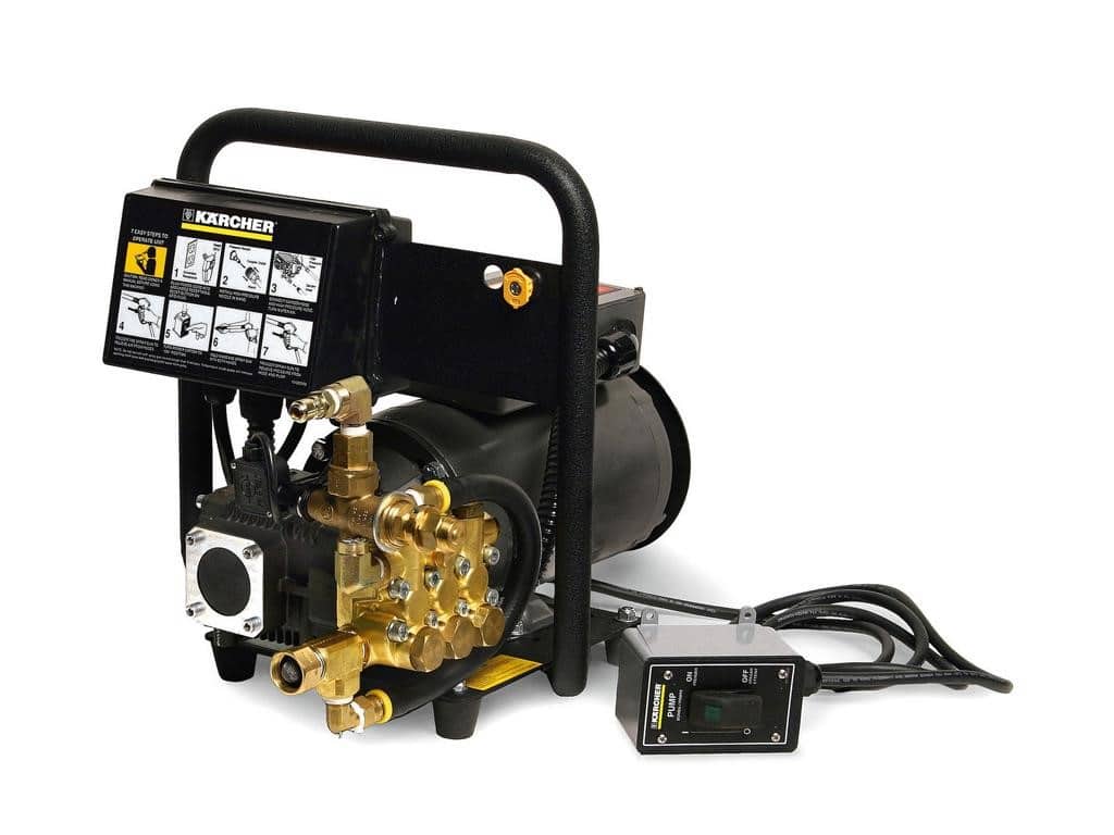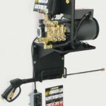 Kärcher’s wall-mounted cold-water pressure washer is designed with a durable steel frame, a quiet 1,725 RPM motor, and is the perfect solution for in-shop uses. A remote on/off switch with a 10’ electrical cord allows the machine to be mounted high on a wall away from backspray. This cold water pressure washer can accept up to 180°F water. Unit comes with a 7-year Kärcher triplex crankcase pump. Optional wall mount bracket is also available. ETL certified to UL and CSA safety standards.