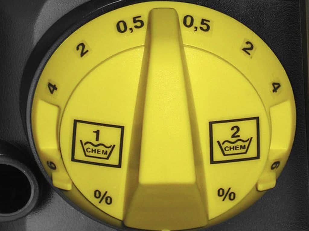 • Unique CHEM switch system allows operator to switch between two on-board detergent tanks without interruption; includes precise two-way metering valve to accurately vary detergent volume.