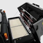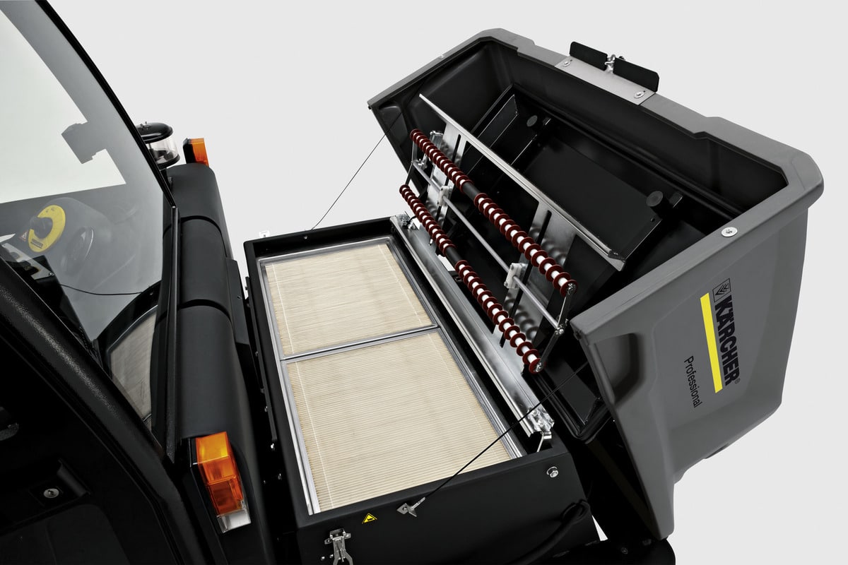 The robust, fully hydraulic and LPG-operated industrial sweeper KM 150/500 R LPG for the indoor and outside area is suitable for extreme applications, e.g. in construction material and metalworking companies or foundries, as well as in all other industries with dirty conditions. Thanks to the dustpan principle fine waste and coarse dirt are reliably picked up. The sweeper roller is automatically adapted to floor unevenness and the innovative sweeping system reduces wear to a minimum. The main sweeper roller can be changed in an instant without any tools. The waste container closes automatically during transport. Two horizontal flat pleated filters also ensure clean air conditions in very dusty conditions. The filter cleaning is done at the touch of a button with an extremely effective dual scraper. The filter is easily accessible and is easy to change without the need for any tools. And the engine is also easy to reach. The basic functions can be conveniently operated with a rotary knob thanks to the EASY Operation concept. A cyclone prefilter cleans the air before it reaches the filter of the motor and increases the service life considerably.