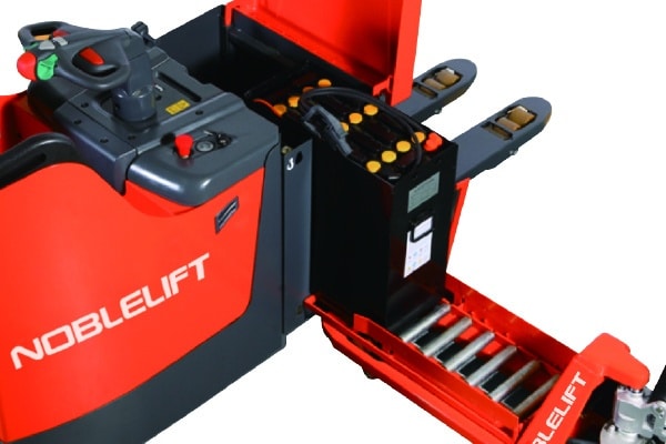 • Sideways battery exchange Sideways battery exchange compartment for quick and safe battery exchange. Because the battery compartment is lifted with forks, various exchange heights are easy to reach.