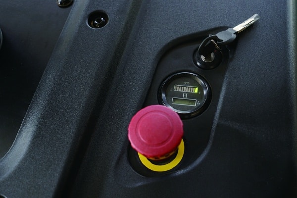 • Control elements Key-switch, emergency switch, and battery discharge indicator.