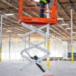 The Snorkel S3019E self-propelled electric scissor lift stacks the deck. This all-electric lift features a sunken scissor stack that stows inside the chassis, offering a low step-in height. Compact and nimble, its slim design easily fits through doorways and on passenger elevators.
